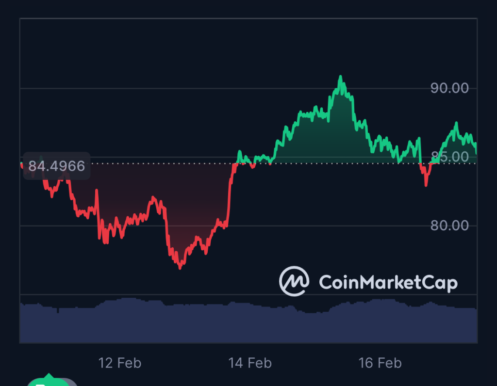 แม้จะมีการพัฒนาอย่างต่อเนื่องและการยอมรับในบล็อกเชนเพิ่มขึ้น แต่ในสัปดาห์ที่ผ่านมา Solana ก็เผชิญกับความท้าทายด้านราคาสำหรับ SOL ตั้งแต่วันที่ 12 ถึง 18 กุมภาพันธ์ SOL เพิ่มขึ้นเพียงเล็กน้อยจาก 81.18 ดอลลาร์เป็น 83.21 ดอลลาร์ ไม่สามารถทะลุผ่านแนวต้านสำคัญที่ใกล้ 85 ดอลลาร์ได้อย่างน่าเชื่อถือ