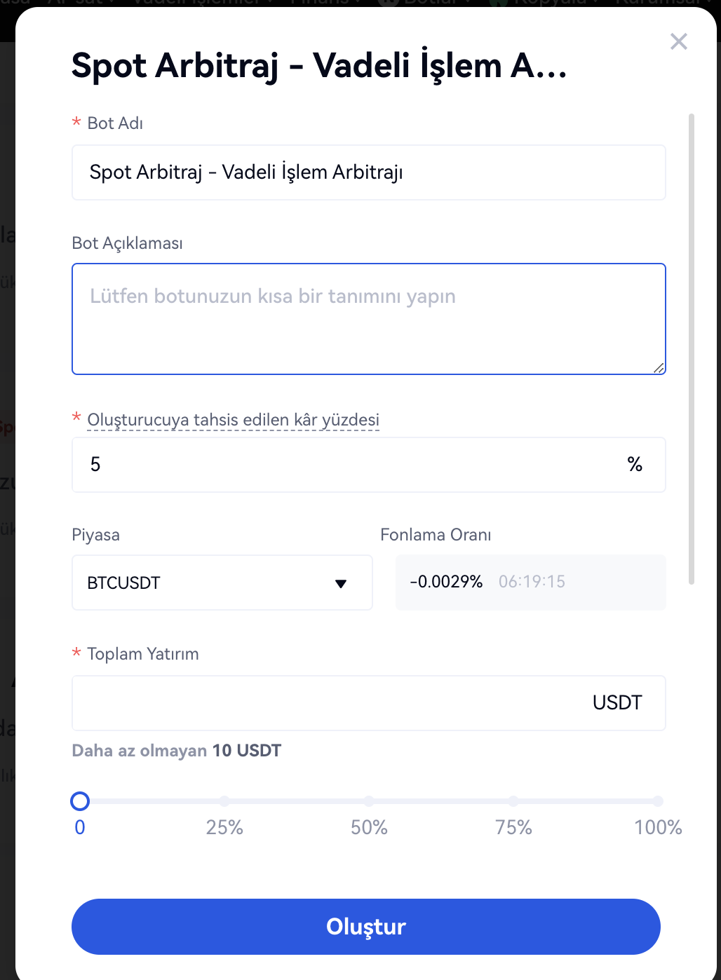 İkinci olarak, toplam yatırım tutarını girin. Spot satın almadan spot-futures arbitrajı yapmak için yalnızca USDT yatırmanız gerekir.