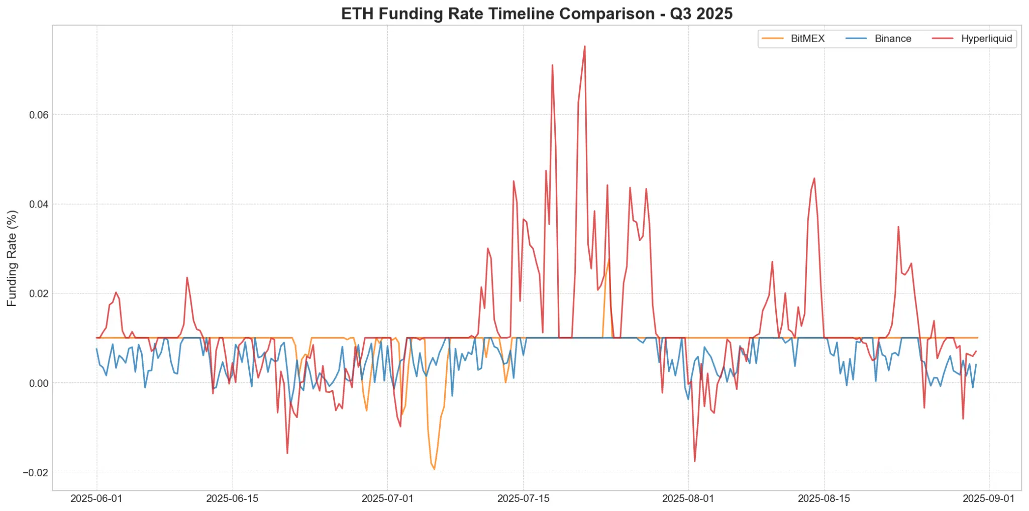 Funding rate analysis of Ethereum (ETH) on BitMEX, Hyperliquid, and Binance, as well as Hyperliquid