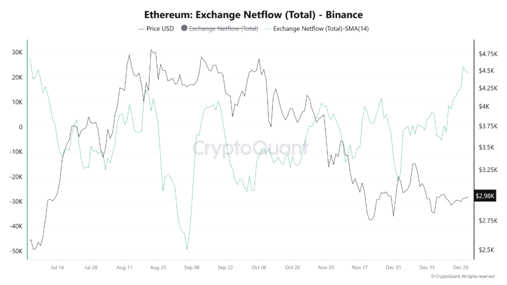 According to CryptoQuant data, Binance’s Ethereum exchange net inflow (14-day moving average) continued to surge sharply after Christmas, reaching 245,000 ETH, which is more than the 140,000 ETH observed before Christmas. This marks the highest net inflow since early July. Positive net inflow indicates that the amount of ETH deposited into Binance exceeds the amount withdrawn. Such a surge suggests that investors are transferring large amounts of ETH from cold wallets to exchanges. From historical data, a significant increase in positive net inflow is usually positively correlated with rising selling pressure or high volatility. Currently, ETH’s price is consolidating just below $3,000, having recently pulled back from a high point. The $3,000 level has become a short-term resistance and an ideal price for fixed-amount selling. This influx of liquidity may imply two scenarios: