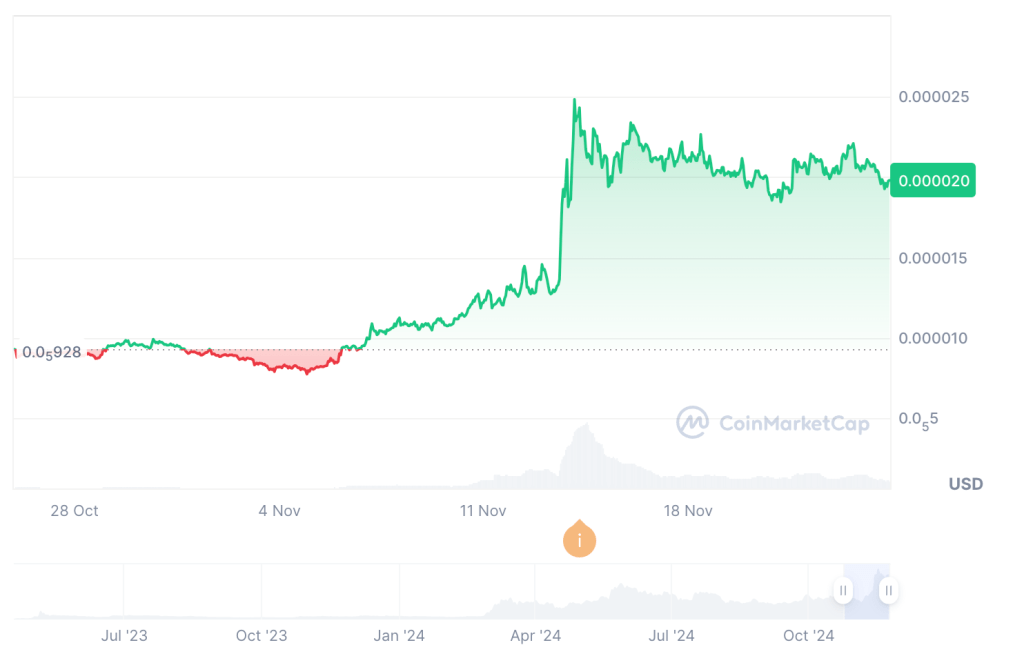 Ethereum-based meme coin Pepe was one of the big winners of the crypto bull run. On November 14, the token broke its all-time high, reaching $0.00002524. Moreover, on-chain data and technicals suggest that the token is in a position to grow much more