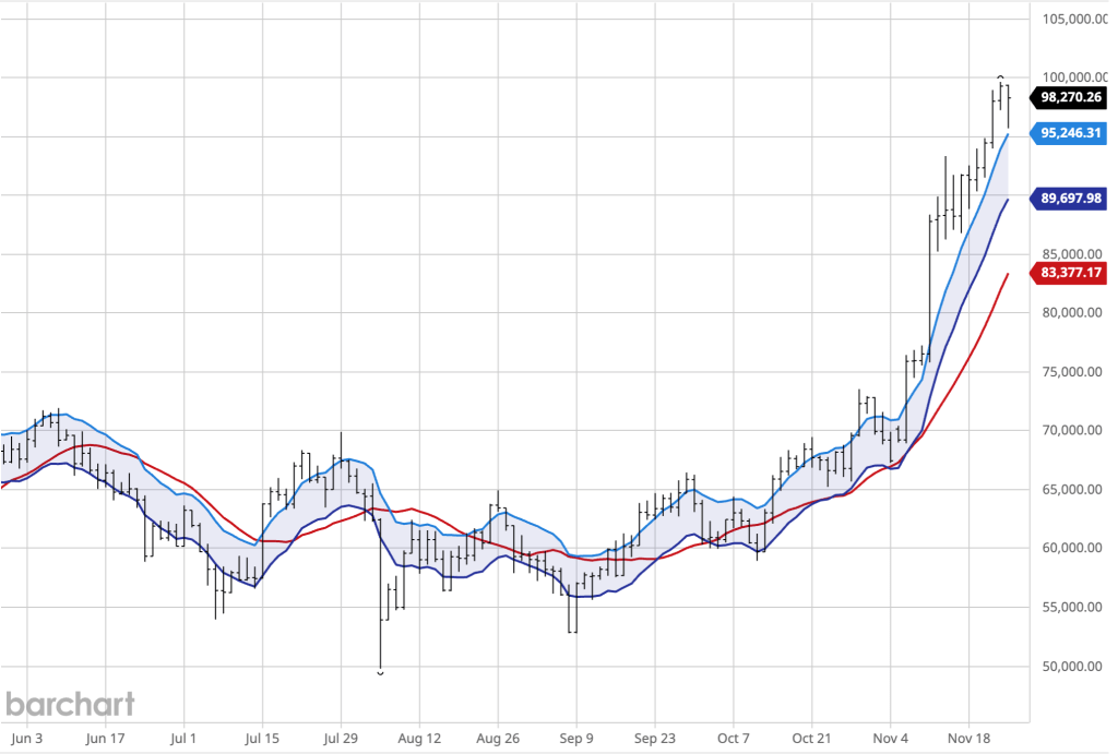 Currently, Bitcoin is trading at $93,587, a 39% increase in the last 30 days. Technicals are mixed, but overall are showing buy signals. For one, the Relative Strength Index for Bitcoin is 78, which is deep in the overbought level. However, Moving averages are still significantly below Bitcoin’s current price level, which suggests that there’s still upward momentum