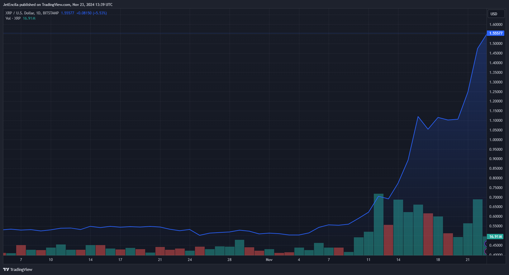XRP’s price has reached $1.43, marking a monumental 25% increase in the past day alone, bringing its weekly gains to a solid 50%. For investors and traders, the question isn’t if the altcoin will break its ATH but when.