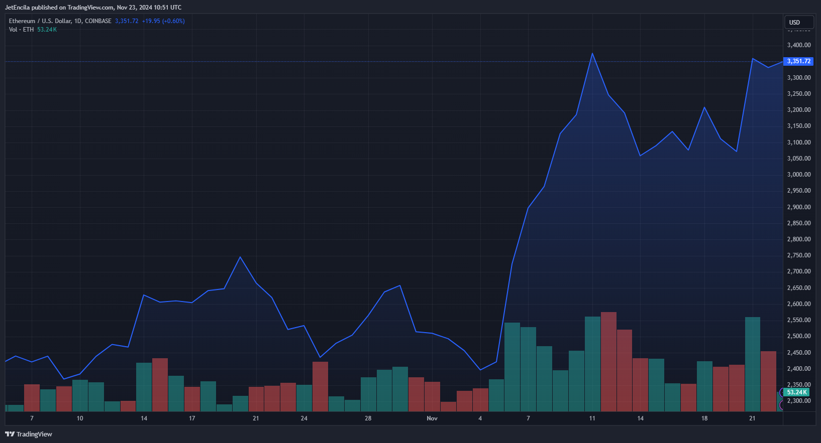EtherNasyonal has suggested that as Ethereum repeats this pattern in the current bull market, it could signal a similar massive price surge, with a potential rally above $10,000. As of writing, CoinMarketCap reveals that the price of Ethereum is trading at $3,353, marking a 7.24% surge in the last seven days. At its current price, a rally to the $10,000 mark would represent a 198% increase for Ethereum, highlighting a substantial surge in value.