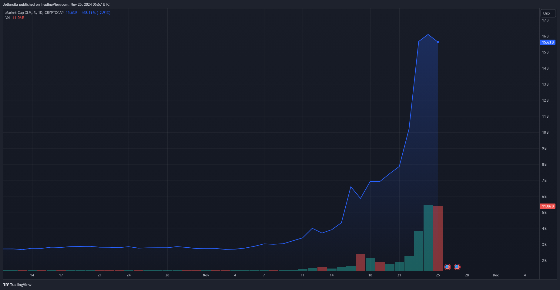 Stellar’s market capitalization has reached $17.3 billion, surpassing Shiba Inu and approaching the top 10 cryptocurrencies, following an impressive 480% increase in the last month.