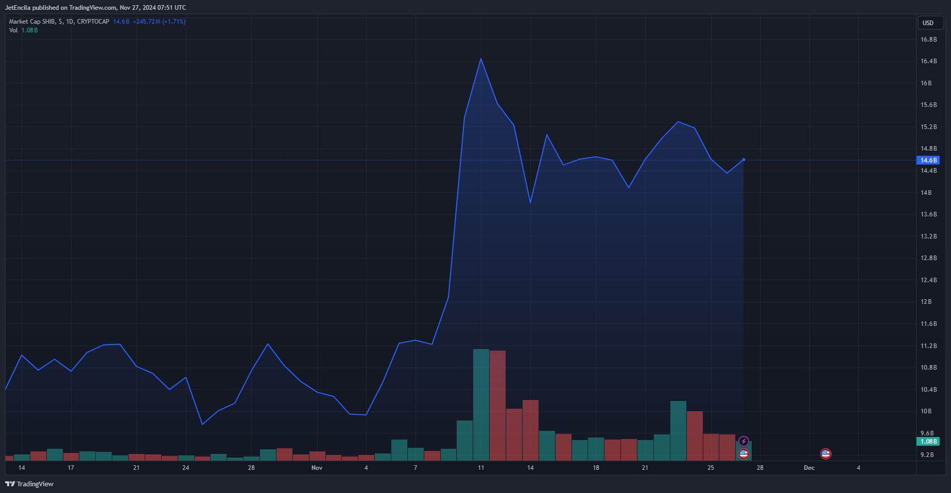 SHIB market cap currently at $14.6 billion. Chart: TradingView.comDespite the favorable short-term development, the price of SHIB has dropped by 4.08% over the last six months, suggesting considerable volatility.