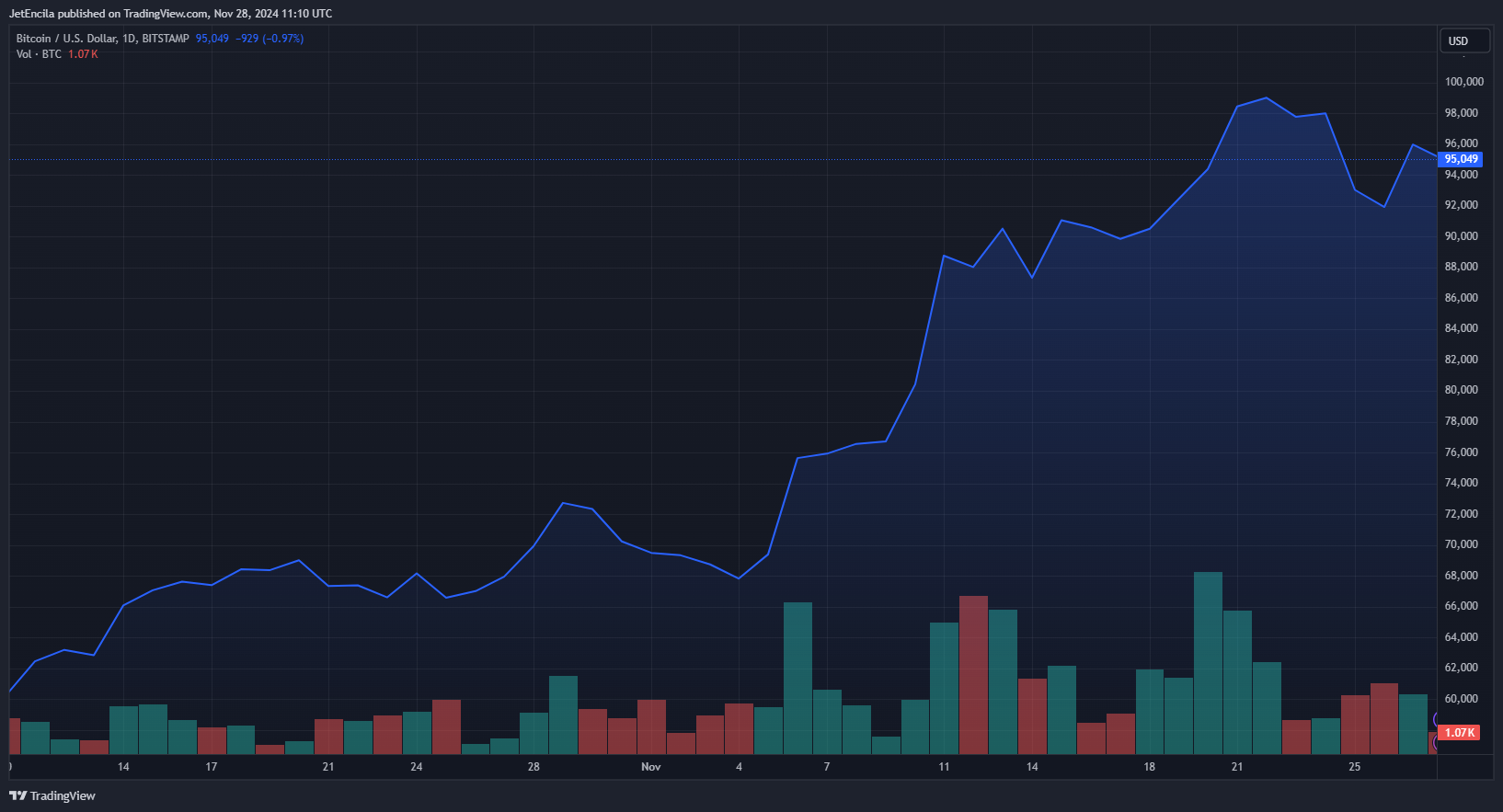 The price of Bitcoin is back and trading above $95,000 after surging 2.70% from the previous day’s close. The asset’s recovery is a welcome development for holders and investors, who have witnessed a two-day decline, dipping to $90k on November 27th.