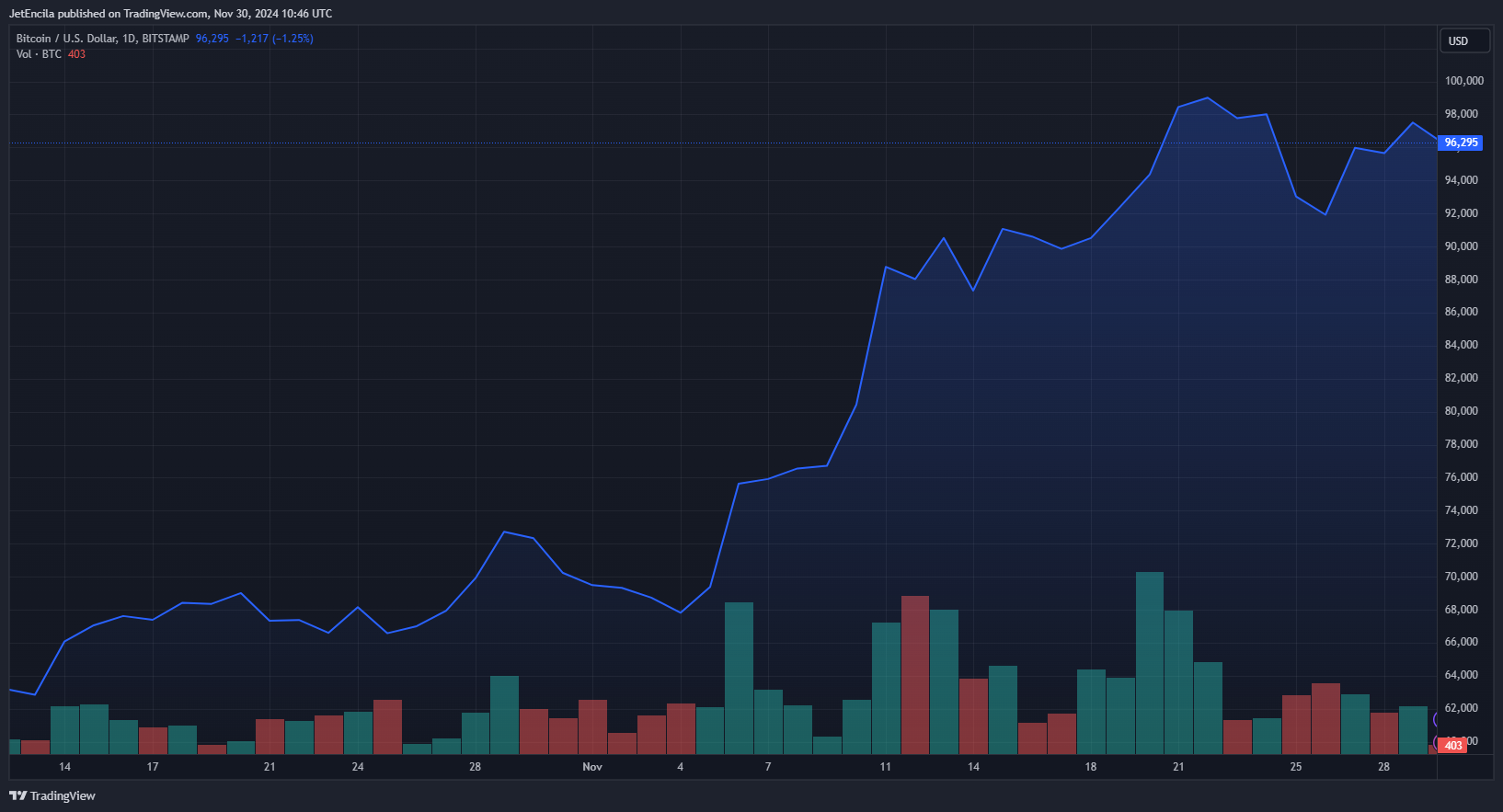 As of press time, BTC is being traded at $96,722 per coin, with a total market capitalization of $1.9 trillion.