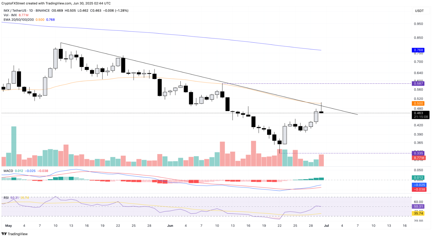Якщо IMX зможе успішно закритися вище цієї трендової лінії та 50-денного EMA, це буде сильним сигналом до прориву і може призвести до досягнення місячного максимуму в 0.58 доларів.