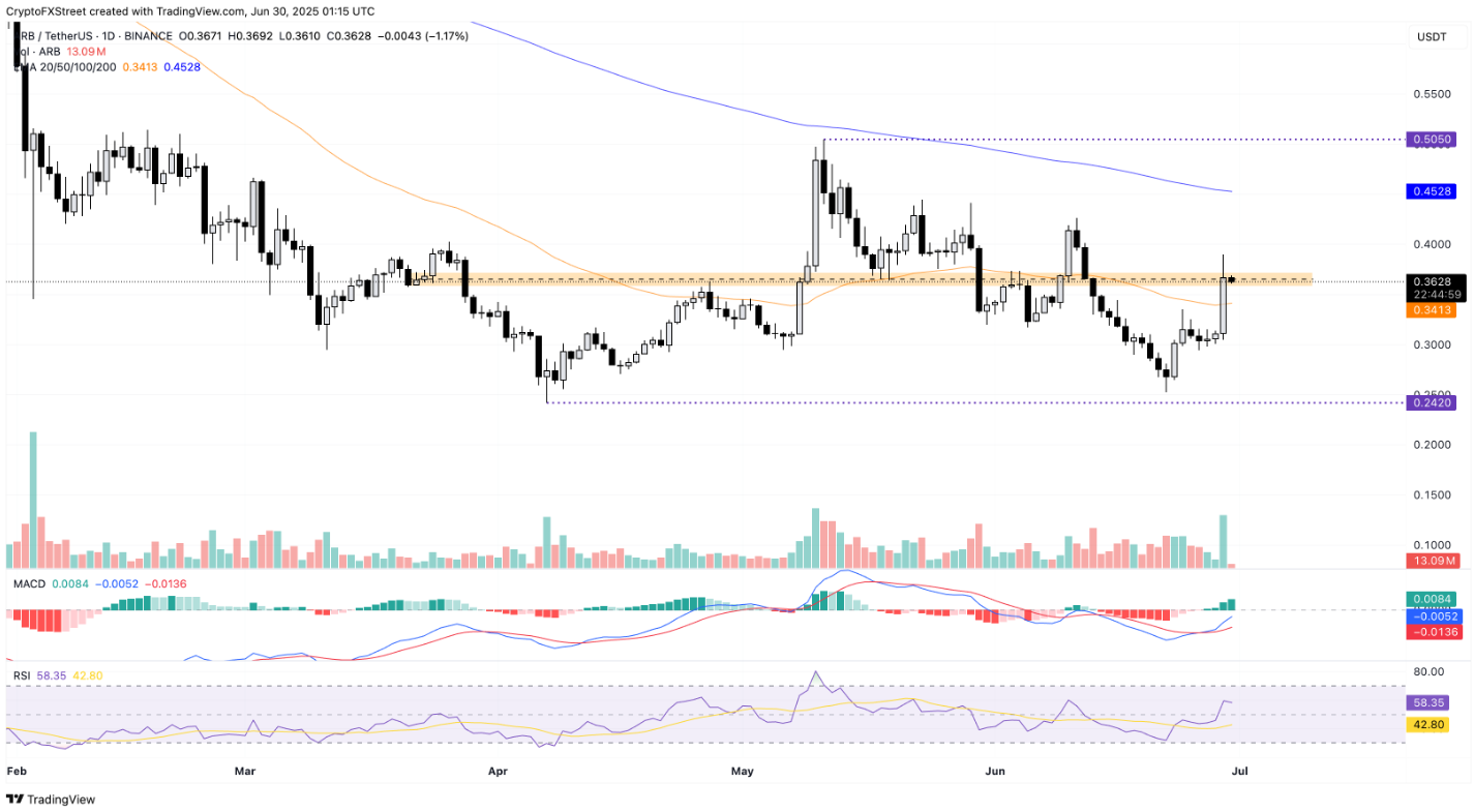 Однак, якщо ARB зазнає відмови в поточній зоні постачання, може відбутися корекція, і ймовірно, буде повторно протестовано 50-денну EMA приблизно на 0,34 долара. Інвесторам слід уважно стежити за цією ключовою точкою.