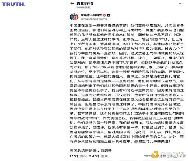 Ринкова катастрофа 11 жовтня 2025 року отримала у галузі назву “подія 1011”. Ця екстремальна ситуація, що призвела до ліквідації більше 19 мільярдів доларів за один день і падіння біткоїна на 15 000 доларів, не є ізольованим випадком, а є наслідком поєднання макроекономічної політики, структурної вразливості ринку та локальних тригерних механізмів. Її складність і руйнівна сила змушують згадати про момент Лемана під час глобальної фінансової кризи 2008 року. Далі ми розглянемо глибшу логіку цієї кризи з точки зору макроекономічного фону, вразливості ринку, тригерних механізмів, ланцюгів передачі та механізмів ліквідації. Глобальна макроекономіка: тарифна політика Трампа та торговий конфлікт між США та Китаєм. У другій половині 2025 року глобальна економіка вже перебуває під високим тиском. Після кількох раундів підвищення ставок і розширення дефіциту, питання фінансової стійкості США викликає серйозні сумніви, індекс долара залишається на високому рівні, а глобальна ліквідність стискається. На цьому фоні, в ніч на 10 жовтня (східний час США), Трамп раптово оголосив про введення 100% мита на всі імпортні товари з Китаю, що не тільки значно перевищило очікування ринку, але й перетворило торговий конфлікт між США та Китаєм з “структурного тертя” на “повну економічну конфронтацію”. Ця політика миттєво зруйнувала ілюзії ринку про “пом'якшення” між США та Китаєм. Азійсько-Тихоокеанські фондові ринки першими зазнали тиску, ф'ючерси на американські акції різко впали перед відкриттям торгів. Що ще важливіше, логіка оцінки глобальних ризикових активів була повністю порушена. Для криптоактивів, які сильно залежать від ліквідності в доларах та ризикового апетиту, це безсумнівно є системним ударом. Можна сказати, що на макрорівні було надано “чорного лебедя” як зовнішній шок, що стало первинною причиною події 1011. Крім того, вразливість ринку: напруга ліквідності, надмірний левередж, емоційна перевитрата. Однак, чи зможе будь-який зовнішній шок перетворитися на кризу, залежить також від вразливості самого ринку.