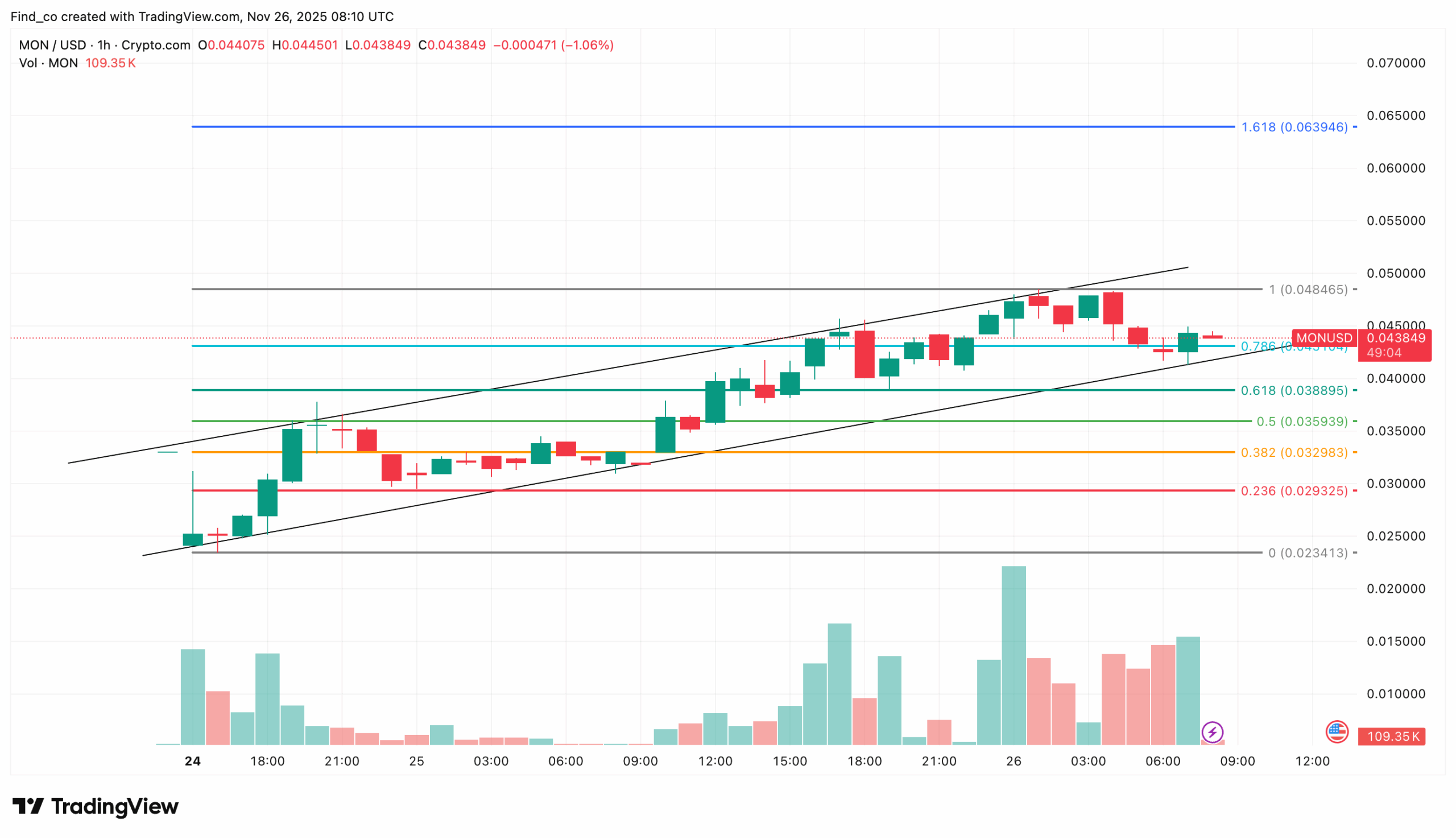 Незважаючи на неоднозначні настрої ринку щодо MON, графік за 1 годину показує більш позитивні короткострокові перспективи. Цей Токен наразі торгується в межах висхідного каналу. Якщо Monad продовжить зберігати цю форму, цей альткойн може закріпитися поблизу рівня підтримки 0,041 доларів.