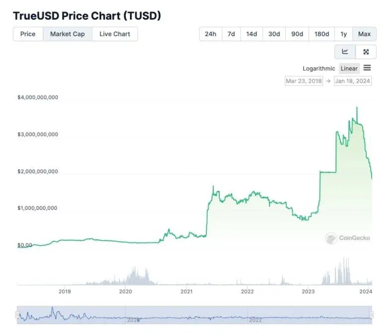 Що стосується ринкової вартості, дані CoinGecko показують, що ринкова вартість TUSD раптово з’явилася в перші три квартали 2023 року, злетівши з 756 мільйонів доларів США на початку року до піку в 3,8 мільярда доларів США в жовтні, але потім почалася Низхідна тенденція. Поточна ринкова вартість становить 2,1 мільярда доларів США. Вона впала приблизно на 40% за місяць.