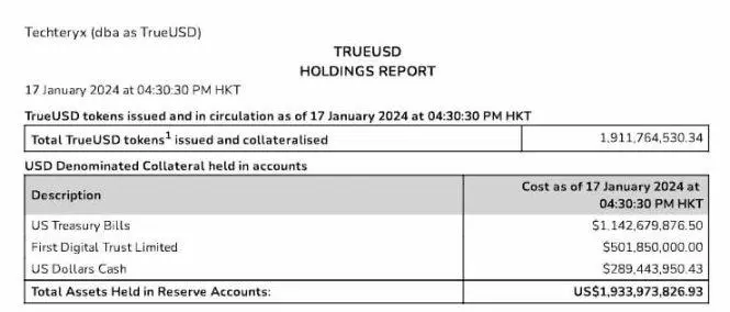 За цих обставин 16 січня TrueUSD оголосила, що бухгалтерська фірма MooreHK надаватиме щоденні послуги з надання гарантій для TUSD і забезпечуватиме прозорість статусу резервів TUSD і деталей резервів. Згідно з останнім звітом про перевірку резервів, станом на 4:30 17 січня іпотечна ставка TUSD становила 101%, а випуск і обіг на Ethereum, Tron, Avalanche, BNB Chain і BNB Smart Chain перевищили 1,9 мільярда (зокрема ( 1 911 764 530,34 доларів США), а загальна вартість активів на резервному рахунку становить 1 933 973 826,93 доларів США, включаючи: