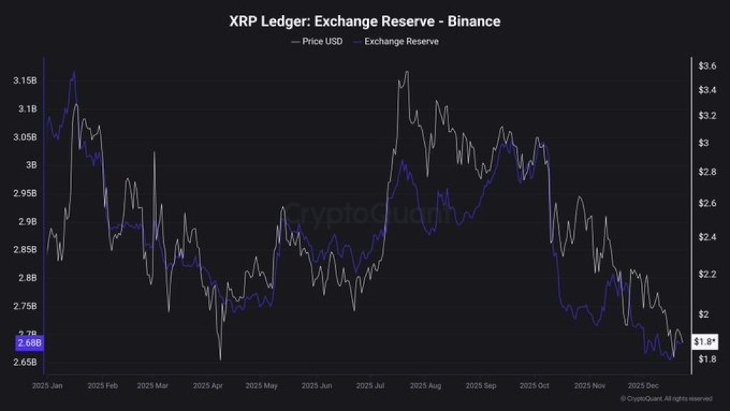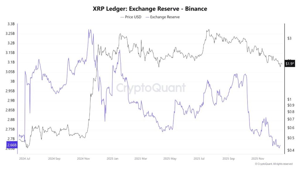 Giá XRP của Ripple vẫn đang đối mặt với một đợt điều chỉnh không đều, nhưng một tín hiệu on-chain đang chuyển hướng theo chiều khác. Kho dự trữ XRP của Binance vừa giảm xuống khoảng 2.66B XRP, mức thấp nhất kể từ tháng 7 năm 2024, dựa trên biểu đồ dự trữ của sàn giao dịch được chia sẻ.