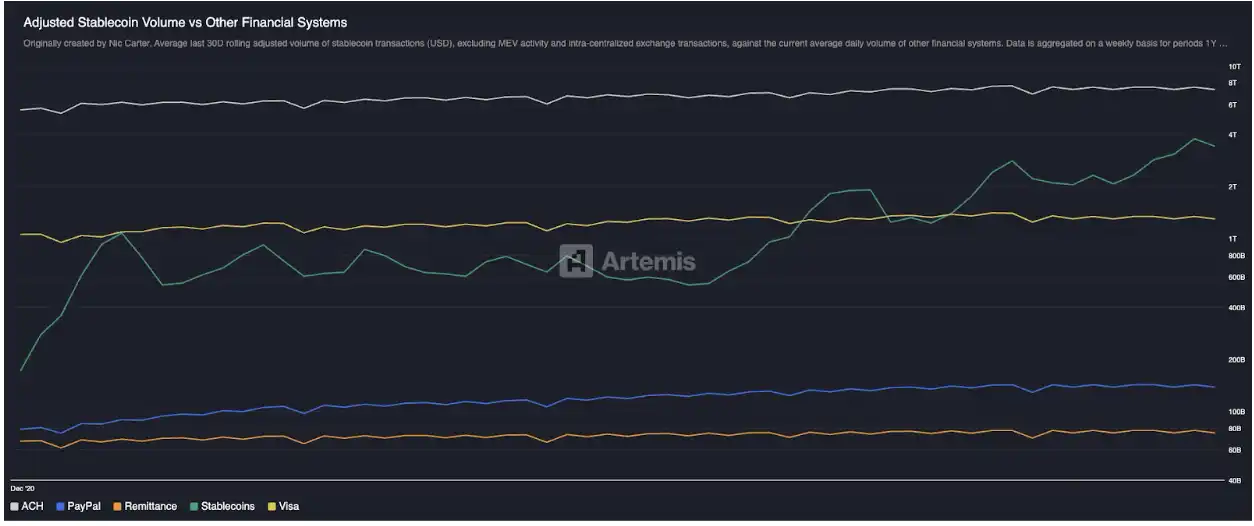 Sự thay đổi này đã được thể hiện rõ ràng trong các ứng dụng quy mô lớn. Vốn hóa thị trường của stablecoin đã tăng từ gần 0 lên khoảng 3000 triệu đô la trong vòng chưa đầy một thập kỷ, thậm chí không bao gồm chuyển tiền giữa các nền tảng giao dịch và giá trị có thể rút tối đa (MEV), khối lượng giao dịch kinh tế thực tế mà nó xử lý cũng đã vượt qua các mạng thanh toán truyền thống như PayPal và Visa. Lần đầu tiên, một mạng lưới thanh toán phi ngân hàng và phi thẻ có thể thực sự đạt được hoạt động quy mô lớn trên toàn cầu.