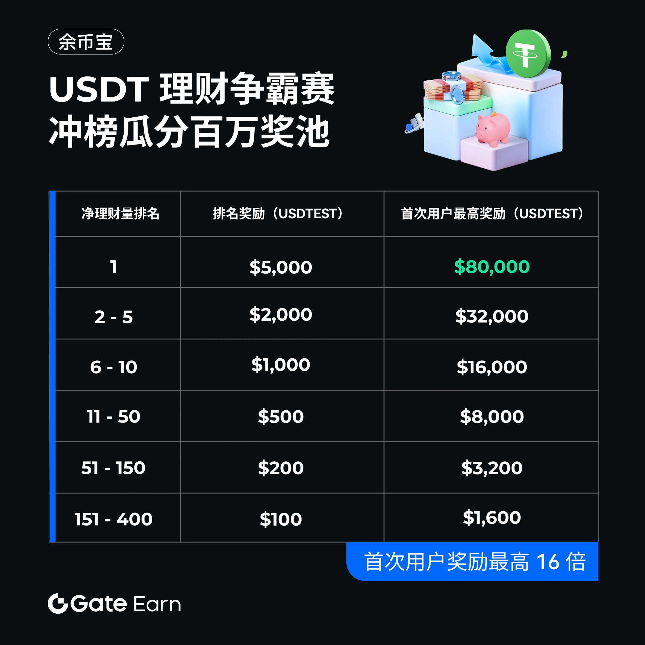 Gate.io Cuộc thi Tiết kiệm USDT Kho báu Thặng dư sẽ được tổ chức trong thời gian giới hạn và 400 người dùng hàng đầu đăng ký sự kiện và tham gia đăng ký các sản phẩm hiện tại và cố định Surplus Treasure USDT, và 400 người dùng hàng đầu về tiết kiệm ròng sẽ có thể chia sẻ tổng giải thưởng. Người dùng lần đầu có thể tận hưởng tiền thưởng lên đến 16x và giành được phần thưởng USDTEST lên đến 80.000 USD.