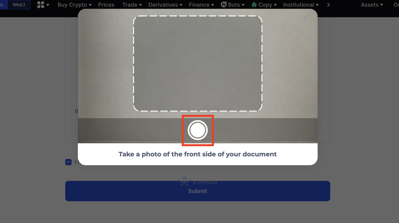 3. Make sure you give permission to your browser to access your PC's camera when doing the live document verification. Follow the instruction, and the following popup will appear, requesting you to take a photo of the front side of your document. Hold the front of the national ID Card/Passpot in front of the camera, and press the circular button to take a photo. You will be asked to take a photo of both the Front and Back (for ID card) of your ID document.