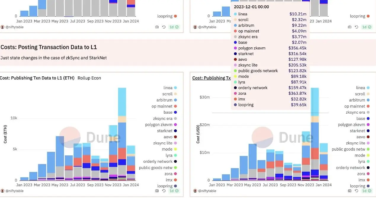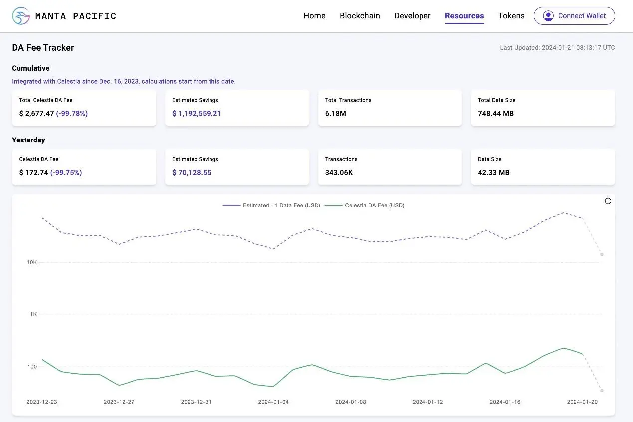 這一點已在Celestia 和Manta 上得到印證。由於選擇Celestia 而不是以太坊DA,Manta 成功節省了近99% 的DA 成本。雖然以太坊也在進行重大升級,將為L2 調用資料引入單獨的區塊空間。
