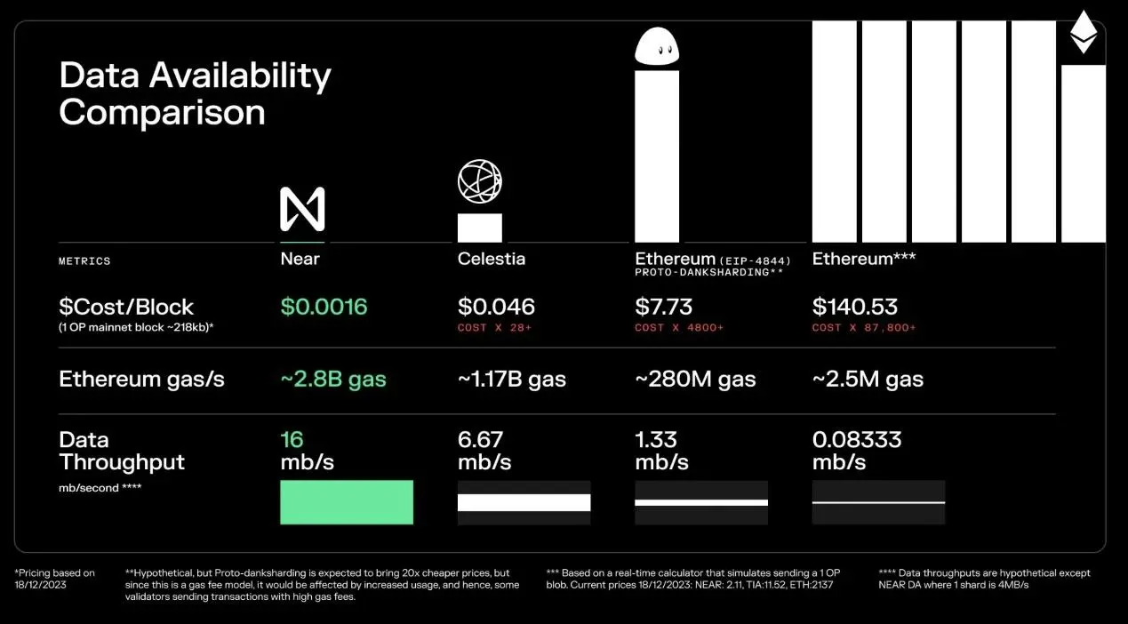 模組化DA 的成本取決於上面討論的各種因素。 Celestia DA 現已上線,目前向Manta 收取3.41 美元/MB;成本也會根據TIA 的價格而變動。 Avail 和EigenDA 尚未上線,NEAR DA 成本最低。