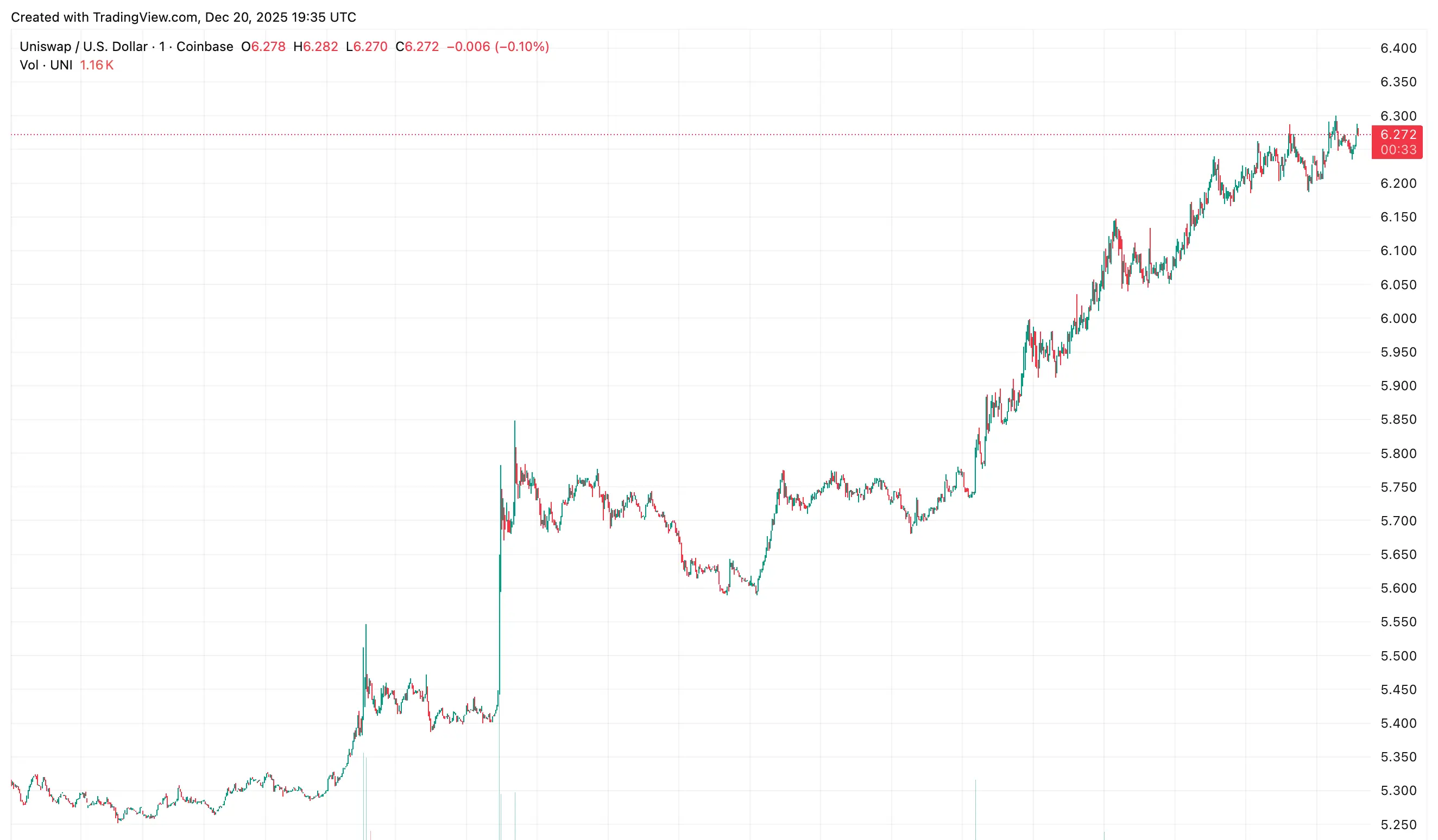 根據某DEX治理數據,UNI代幣在UTC時間12月20日03:50投票期開始後不久開始上升。TradingView的一日UNI-USD圖表顯示,漲幅最大的部分發生在投票窗口的早期,價格從$5.40–$5.50區間突破,並在整個交易日繼續上升趨勢,同時交易量也在增加。