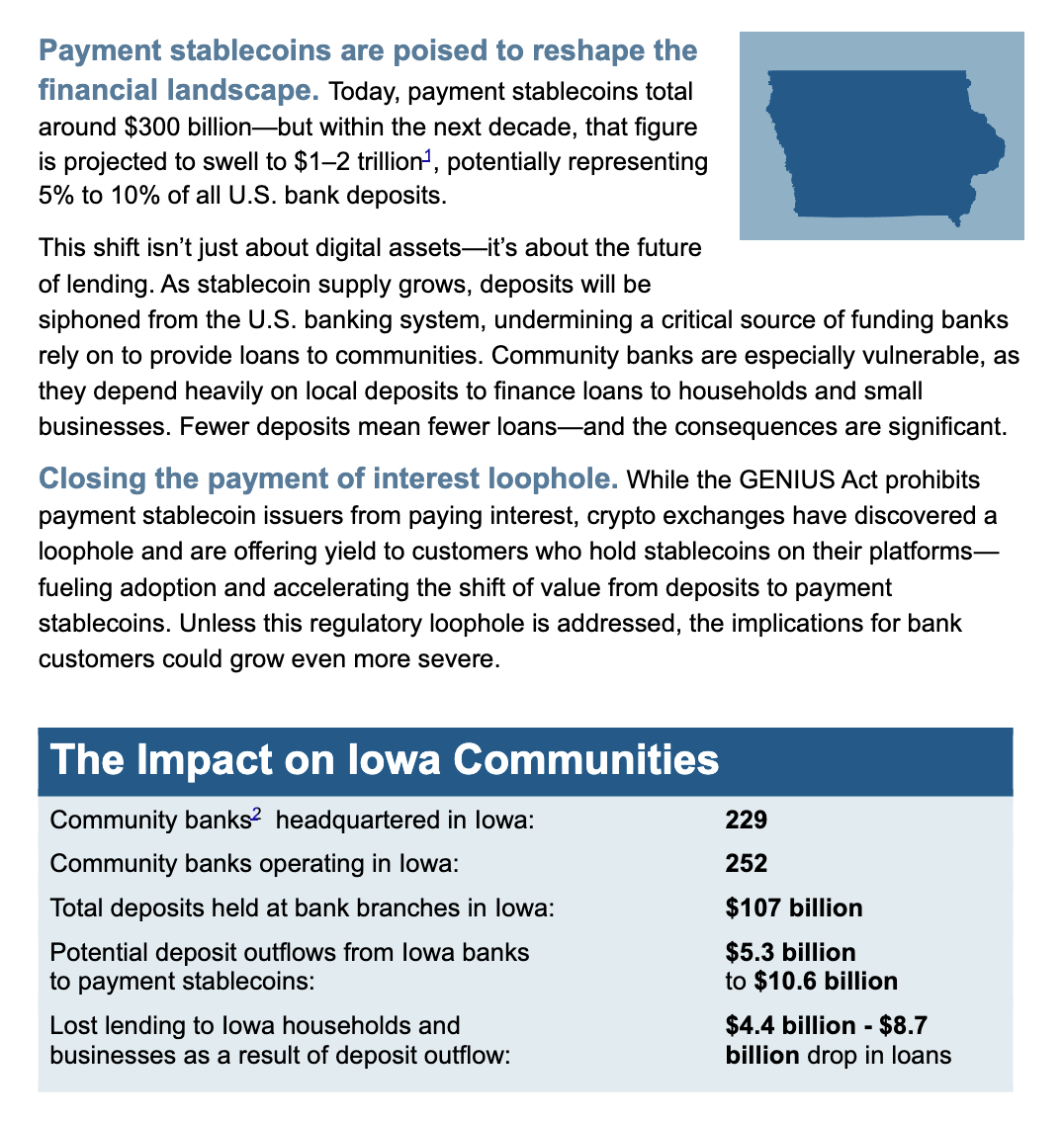 一項針對愛荷華州(Iowa)的模擬分析揭示了具體風險。若穩定幣市場規模成長至 1,000 億至 2,000 億元,甚至達到 1 兆至 2 兆元規模,僅在該州就可能引發 53 億至 106 億元的存款外流。這將進一步導致對當地家庭與企業的貸款能力下降約 44 億至 87 億元。
