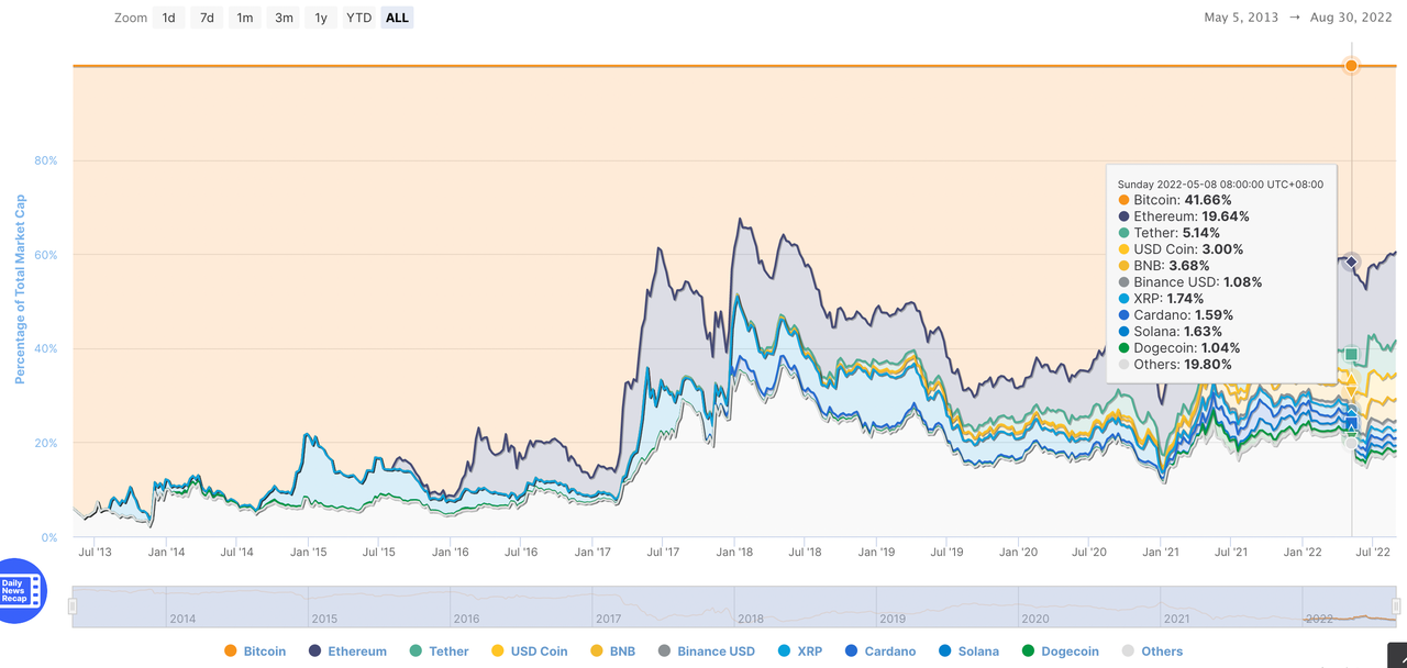 BTC作为整个加密资产的鼻祖,一直以来其行情走势决定了整个加密资产市场的牛熊。整个山寨币走势与BTC的行情走势呈强相关性。因此,在选择合约交易对时,首选BTC是所有加密资产合约玩家的共识。下图为BTC市场占有率走势: