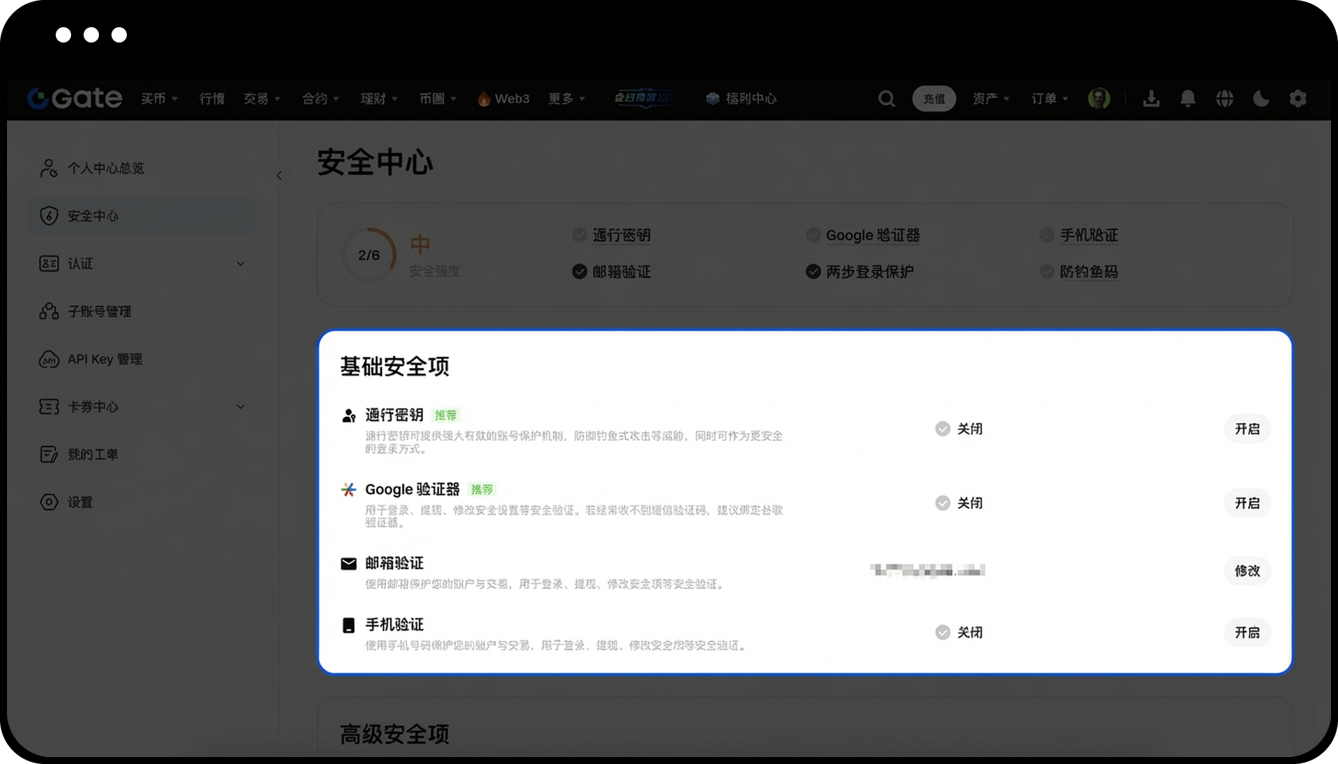注册完成后,点击页面左上角的头像,点击进入用户中心,切换到【安全中心】tab。