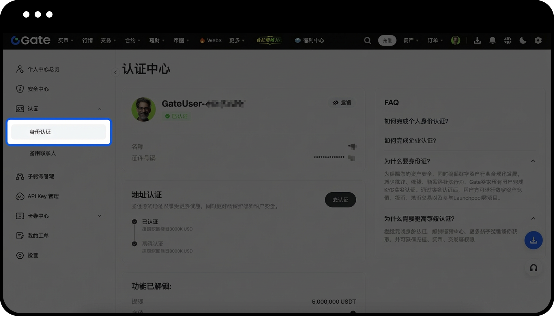 完成安全验证后,进行身份认证(KYC认证):选择个人或企业认证,按照指示填写身份信息并提交。