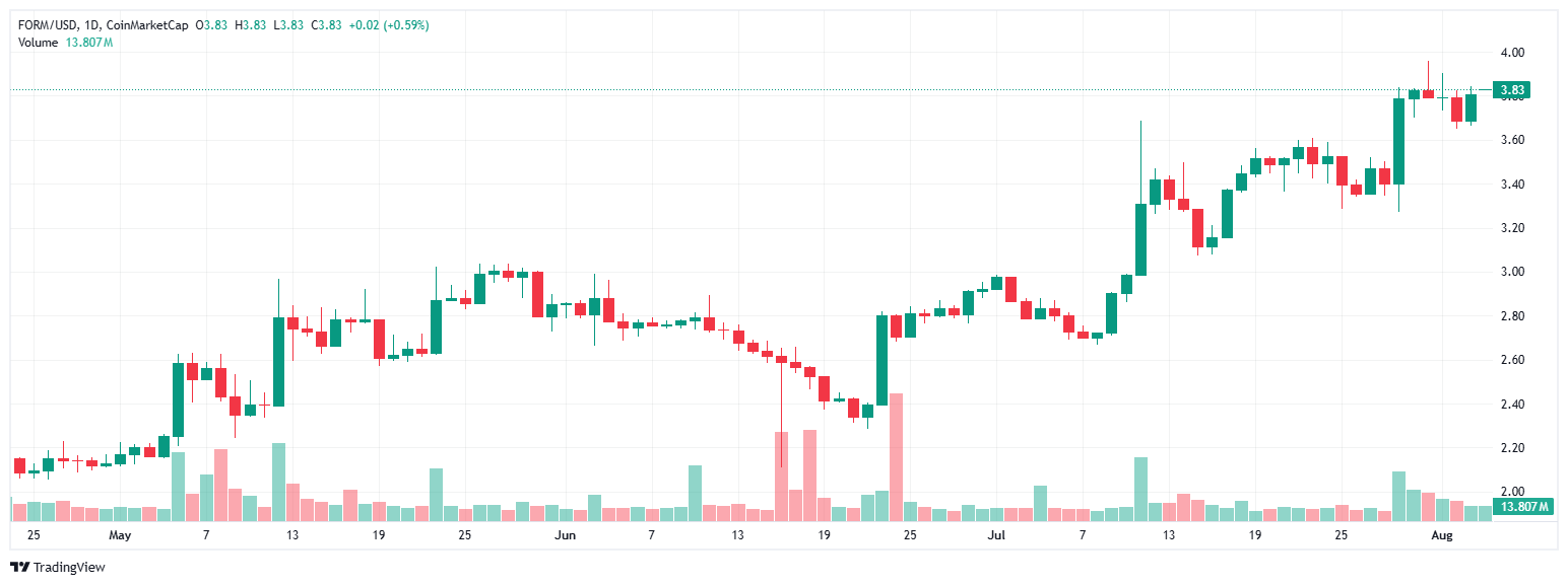 四个(FORM)以强劲的涨幅结束了这一周,成为第二大涨幅的币,显著上涨20%,蜡烛的高位触及4美元。