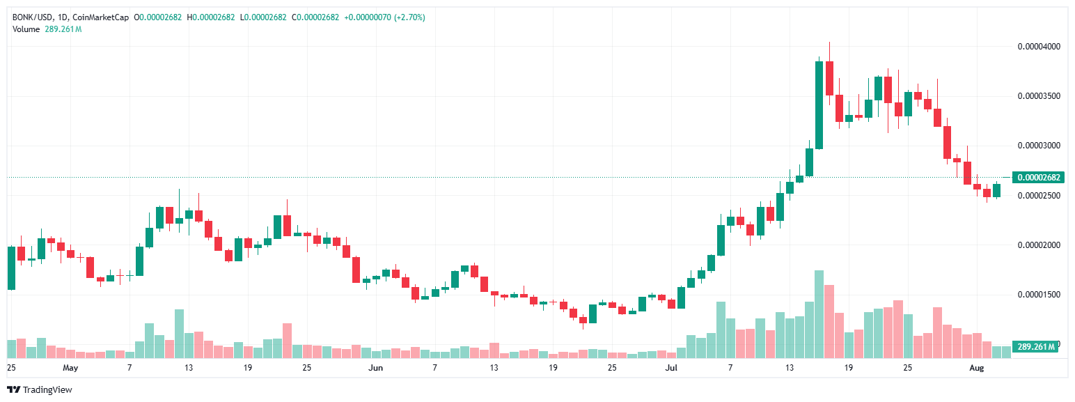 在第二季度的惊人上涨之后,这是BONK的第一周下跌,结束了连续5周的上涨,使其突破了0.00004美元的关口。