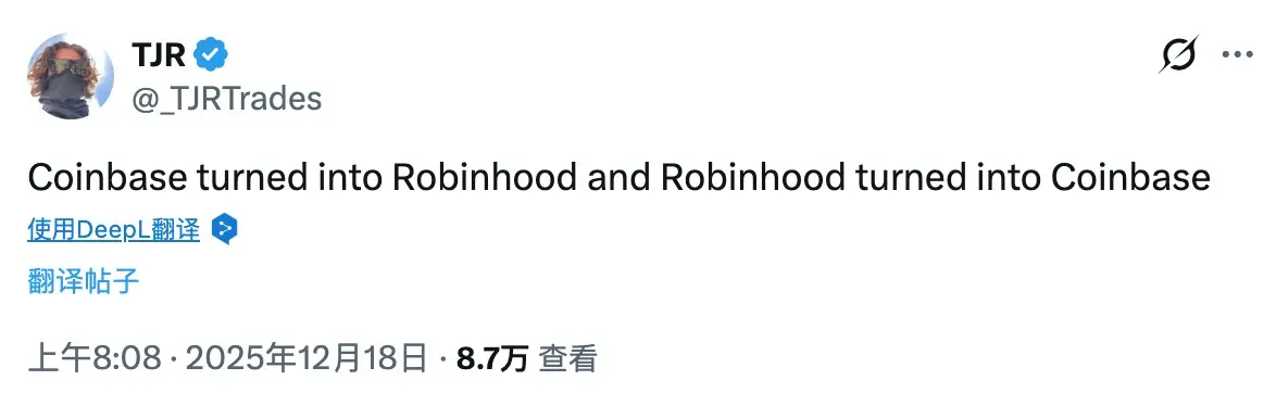 当然,对于这一战略转向,业界也发出了不同维度的评价。去中心化理念的坚持者对此表示疑虑,认为此举偏离了 Crypto 的初衷。也有市场观察者从行业演进的角度指出,金融科技服务的边界正日益模糊——「Coinbase 正在变成 Robinhood,而 Robinhood 也在变得更像 Coinbase」。