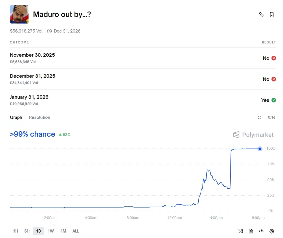 美东时间 1 月 2 日晚间 10 点,去中心化预测平台 Polymarket 上「马杜罗是否 1 月下台」合约价格突然跳升,事件在三小时后获得证实,美国总统特朗普宣布美军逮捕委内瑞拉总统马杜罗。这些押注马杜罗的金额总达 5600 万美元。