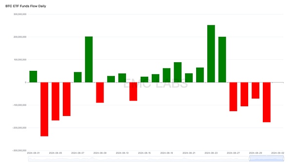 然而,8月美元加息越发确认之际,日元意外加息,套利交易者者凶猛平仓,引发全球股市剧烈震荡,使得被视作高风险资产的BTC ETF受到影响。月初来自ETF持有者的持续抛售使得BTC直落49000美元,创下数月来的新低,也击穿了“新高整理区”下沿。随后,ETF通道资金逐渐回流(稳定币抄底资金稍后亦涌入),BTC价格被拉回至64000美元,及至月底ETF通道资金重回流出,BTC价格也再次回调跌破60000美元。