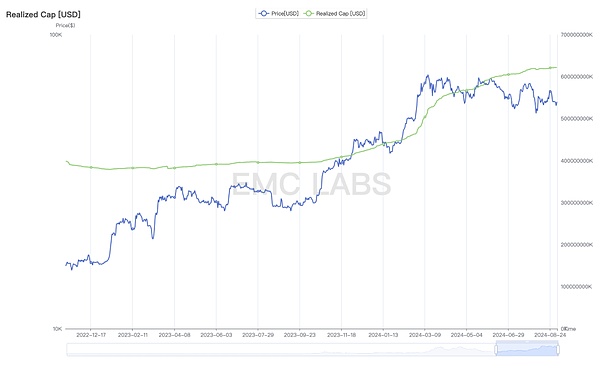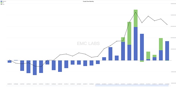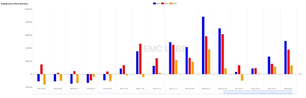 虽然稳定币已经连续三月录得增速流入,但本月ETF通道录得流出,使得8月整体流入资金仅为50亿美元,低于7月的59亿。EMC Labs认为,在筹码分布愈发稳固背景下,资金流入是8月BTC能够在大崩坏之后拉回至65000美元的根本原因,然而资金流入的减少使得本月高点65050美元远低于7月的70000美元。而资金减少即来自ETF通道资金流入由7月的32亿降至本月流出7283万美元。